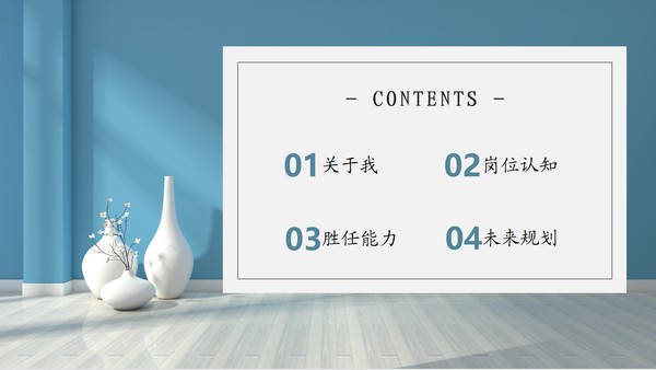 这款个人述职报告ppt模板风格比较清新淡雅,采用了房间的一角作为背景图片,你可以看到图片上阳光从窗户透过,洒向地板和墙壁,地面上的花瓶和花枝懒洋洋的沐浴在阳光之下,十分惬意,具体样式可以参考下文展示,喜欢的小伙伴们快来下载吧~