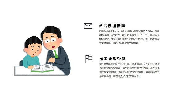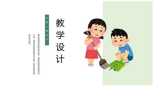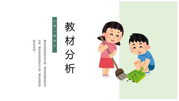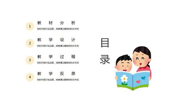 可爱卡通教学课件ppt模板,这款PPT比较适合小学老师们制作教学课件使用,因为它的画风比较童趣,图案展现的是孩子和父母、老师以及同学和谐共处的画面,具体样式可以参考下文中的模板预览,其内容主要包括教材分析、教学设计、教学过程以及教学反思几个方面。