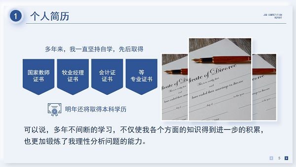软件是专门用来制作竞聘岗位的文档模板,格式为ppt,文档的页面风格简约大气,让用户制作出更加出色的竞聘报告,增加面试官对自己的印象,从而提升自己被录取的几率。