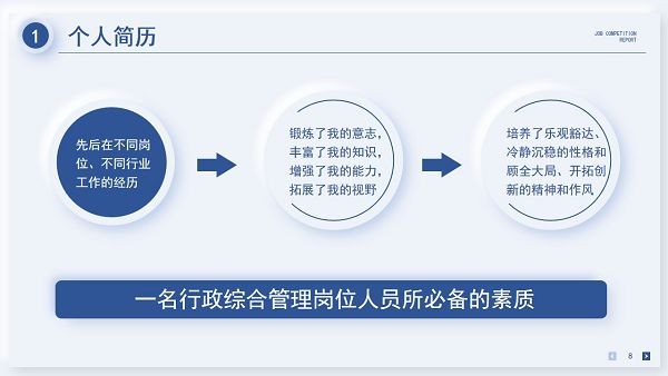 在求职找工作的过程中,如果想要增加自己被录取的几率,可以通过制作出色的竞聘报告来实现,现在为大家分享的这款行政综合管理岗位竞聘报告PPT模板就是一个非常不错的报告编写模板工具,适用于想要应聘行政综合管理岗位的朋友们,让大家更好地展示自己的优势,在面试时脱颖而出。