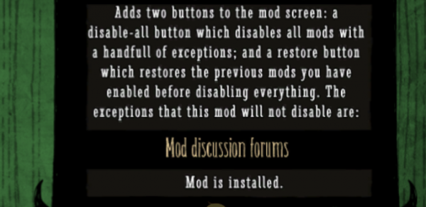 饥荒禁用所有MOD能够为喜欢饥荒的玩家们提供一个很非常实用的新功能,补丁的作者在游戏中制作添加了两个按钮,玩家通过安装补丁可以禁用所有的内容,现在mod的屏幕上包含了一个 disable-all 按钮和一个恢复按钮,玩家能自由选择禁用所有模块,或者在这之前恢复启用的模块。