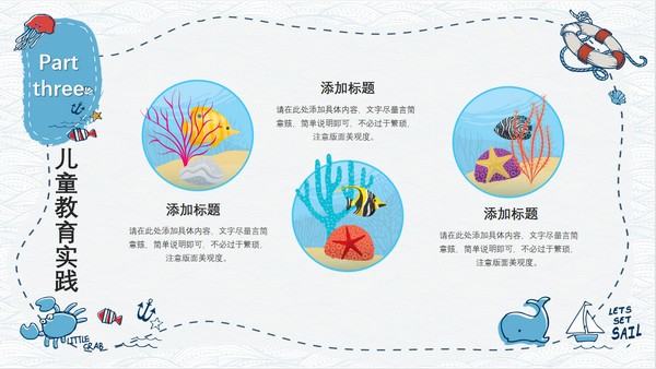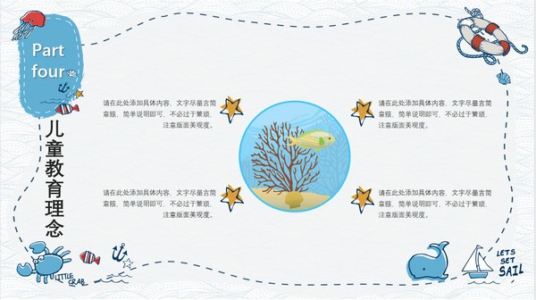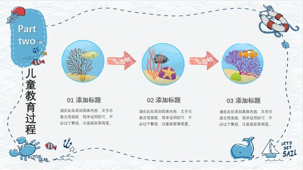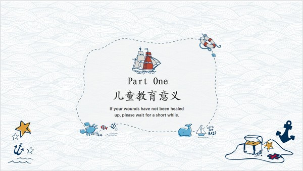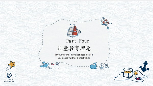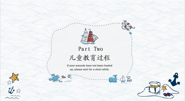 手绘卡通风教育课件PPT模板,该模板画风童趣可爱,采用的都是手绘图案,有帆船、水母、螃蟹、船锚、救生圈、贝壳、鱼等等,超多海洋元素,其内容主要包括儿童教育意义、儿童教育过程、儿童教育实践以及儿童教育理念,源文件为PPT格式,支持编辑修改。