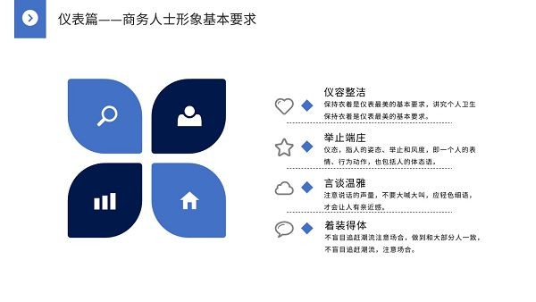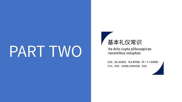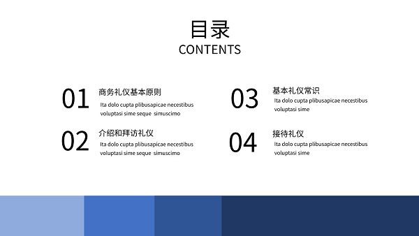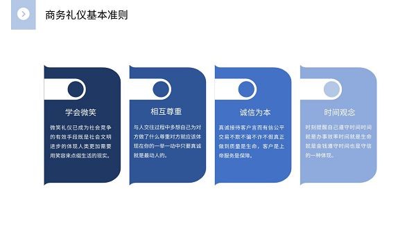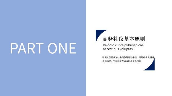 蓝色简约商务礼仪培训ppt模板,这款PPT走的是极致简约的风格,没有什么花里胡哨的图案装饰,只有很简单的蓝色系色块,具体样式可以参考下文模板预览,里面的内容包括商务礼仪基本原则、介绍和拜访礼仪、基本礼仪常识以及接待礼仪,用于企业员工商务礼仪培训非常不错。