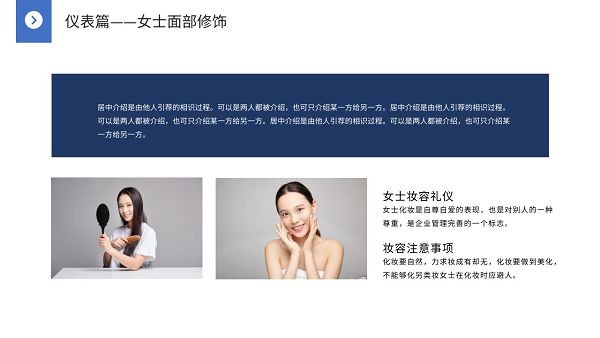 版权声明:蓝色简约商务礼仪培训PPT模板所展示的资源内容均来自于第三方用户上传分享,您所下载的资源内容仅供个人学习交流使用,严禁用于商业用途,软件的著作权归原作者所有,如果有侵犯您的权利,请来信告知,我们将及时撤销。
