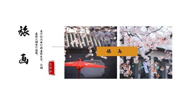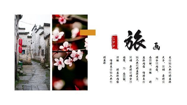 PPT模板封面使用了一张精美古韵荷花背景图片。右侧房子白色矩形,非常实用毛笔字书写了电子相册PPT标题。界面风格古典雅致。