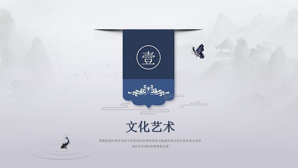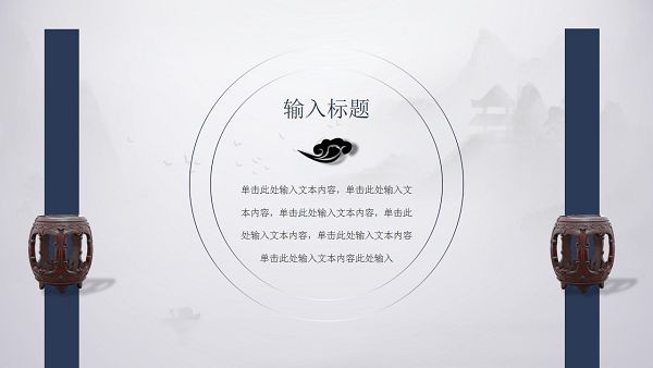 PPT模板封面使用了淡雅灰色水墨绘制的,群山、楼阁、湖泊、小船等背景图片。中间放置蓝色文本框,填写PPT标题文字。界面风格为古典中国风样式。
