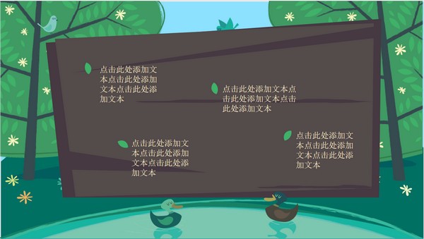简约可爱幼儿园卡通风课件PPT模板,这是非常多的人都在使用人用的一款适用于制作幼儿园主题班会PPT、教学课件PPT的模板,画风清新可爱,采用自然清新的绿色为主色调,还添加了卡通的木板路牌、小鸟、鸭子等图案,具体效果可以参考下文图示,喜欢的话就赶紧来下载吧~