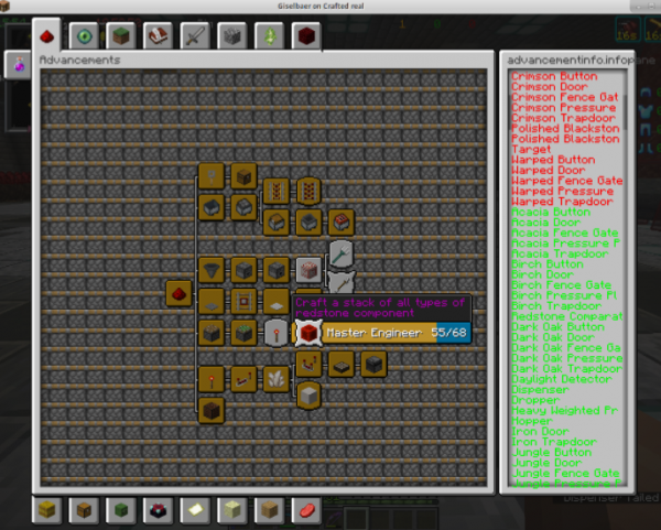 我的世界1.17更大进度界面MOD是一个很非常实用的功能型补丁工具,作者对我的世界中的界面大小进行了修改,玩家打上补丁之后就能在游戏中获得更大的进度界面,现在的界面UI看起来开阔了不少,能够容纳更多的信息,非常方便玩家直观查看,轻松了解进度的具体情况,具体效果如下图所示。
