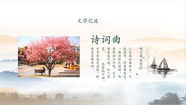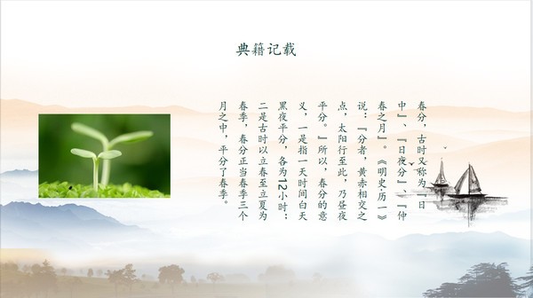 PPT模板封面使用了水墨群山、桃花、小船等背景图片。中间填写春分PPT标题。