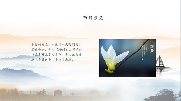 春分作为中国的二十四节气之一,是属于春天的一个节气,今天小编为大家分享的水墨山水背景春分PPT模板软件是专门用来介绍春分的演示文档制作模板,能够帮助用户轻松打造出美观的春分介绍文案,页面上带有优雅的山水、桃花等图案元素,非常符合春分这个节气,使文档更具观赏性。