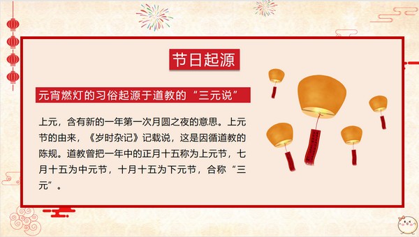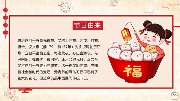 春节刚过完,接下去迎接的第一个节日便是元宵节,元宵节在我们中国的传统节日中地位不凡,这款“2022金色卡通元宵节主题班会活动PPT模板”就是专为今年元宵节主题班会活动而打造的一个PPT模板,里面包含了元宵节起源、发展、习俗以及意义,具体样式可以参考下文展示~