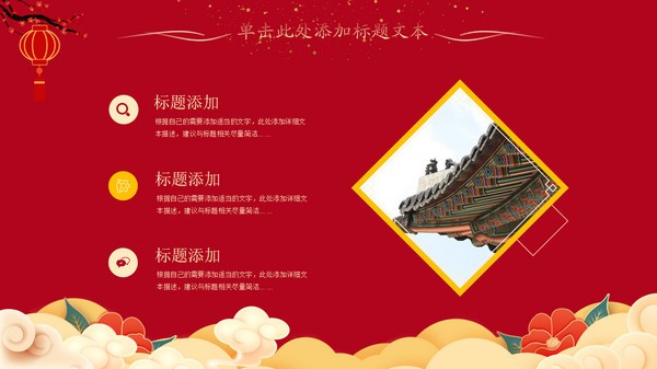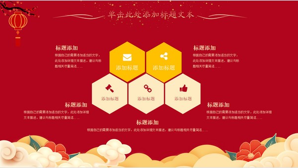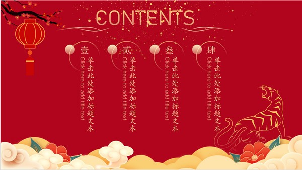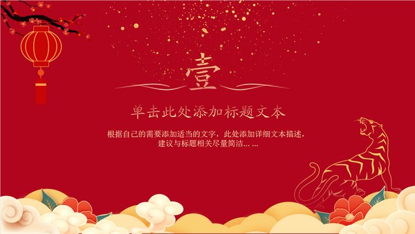 中国红喜庆风新年工作计划ppt模板,本模板共19P,祥云、腊梅、大红灯笼、牡丹、老虎剪纸、金粉元素创意封面、目录页、过渡页,简约扁平化图表,中国新年元素春节风版式内容页,适合春节、新年工作计划等场景应用的喜庆中国新春主题ppt模板。