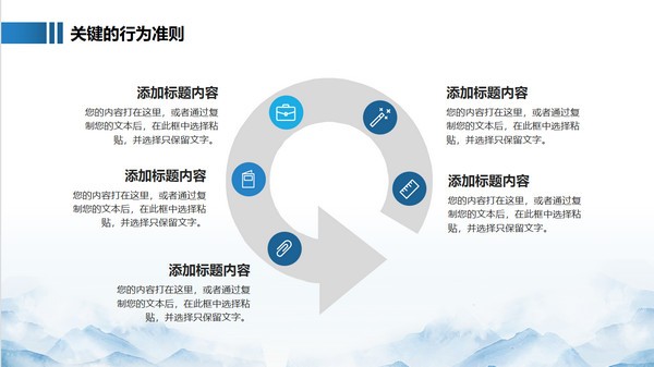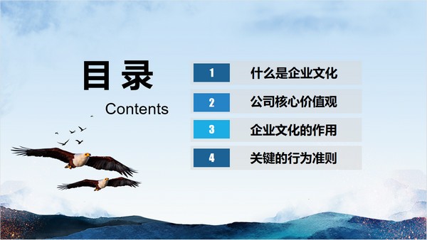 新员工入职的时候非常多的人都在使用企业都会给员工开展培训,其中企业文化就是非常非常重要的的一项,这款“企业文化培训员工培训PPT模板”就是一个十分契合该主题的PPT模板,包含了什么是企业文化、公司核心价值观、企业文化的作用以及关键的行为准则这几个项目,内容支持修改。