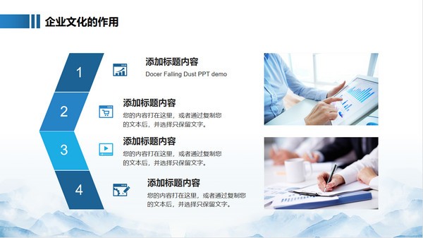 版权声明:企业文化培训员工培训PPT模板所展示的资源内容均来自于第三方用户上传分享,您所下载的资源内容仅供个人学习交流使用,严禁用于商业用途,软件的著作权归原作者所有,如果有侵犯您的权利,请来信告知,我们将及时撤销。