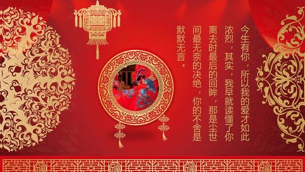 版权声明:红色喜庆中式婚礼庆典PPT模板所展示的资源内容均来自于第三方用户上传分享,您所下载的资源内容仅供个人学习交流使用,严禁用于商业用途,软件的著作权归原作者所有,如果有侵犯您的权利,请来信告知,我们将及时撤销。