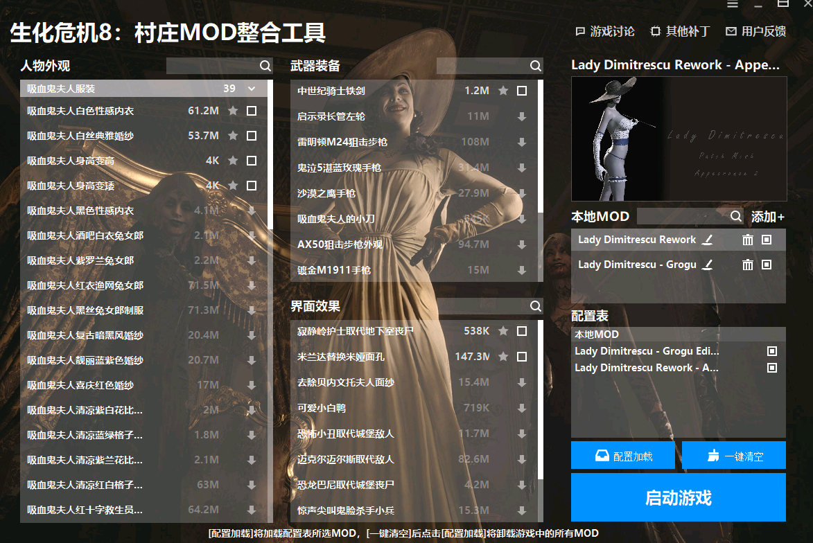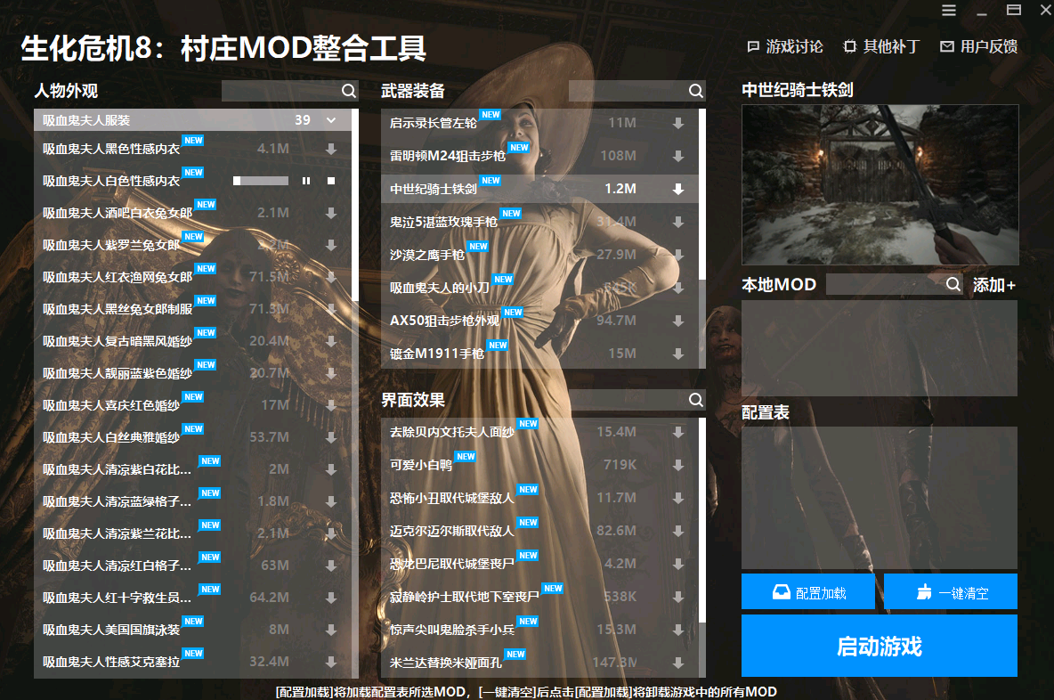 爱好生化危机8村庄MOD玩法的朋友们可以下载这款生化危机8村庄MOD整合工具,工具里面包含了人物外观、武器装备以及界面效果之类的大量MOD,比如中世纪骑士铁剑MOD、米兰达替换米娅面孔等,都是经过精挑细选的,感兴趣的话快来试试吧!