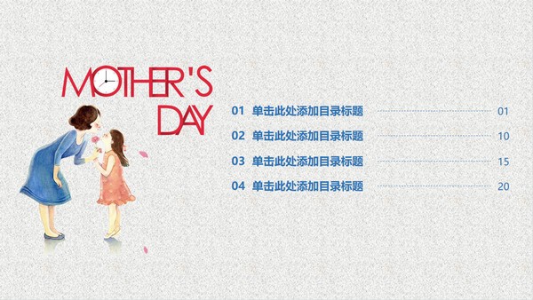 本模板适合用于制作母亲节主题的PowerPoint。.PPTX格式。