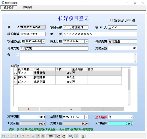 软件可以帮助用户更好地登记并管理传媒相关的业务,支持将具体的信息和类型填写到软件中进行保存,能够保证数据的安全性,非常方便对传媒项目进行统计和分析,支持随时查看。