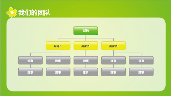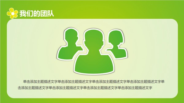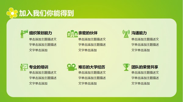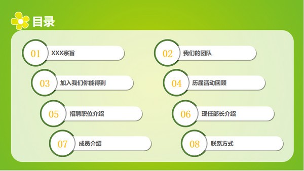 软件采用了小清新的设计风格,色调为黄绿色,带有许多可爱的淡雅花朵元素图案,具有春天生机勃勃的气息,很适合用来制作学生会招新的演示文档,帮助用户招人纳新。