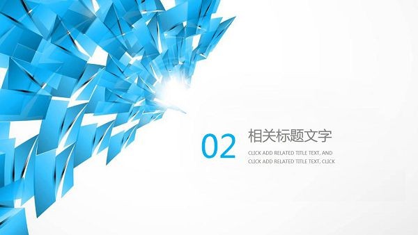 PPT模板封面左侧放置蓝色抽象几何多边形背景图片。右侧填写PPT标题文字。界面风格简约商务。