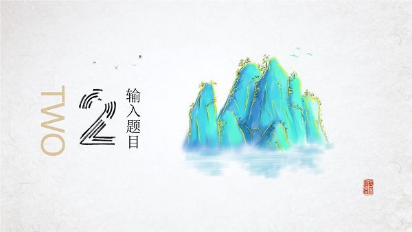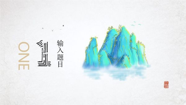PPT模板封面使用水墨绘制的群山、飞鸟、泛舟背景图片。中间房子毛笔字书写的PPT标题文字。后面放置随意金线装饰。界面风格精致唯美。