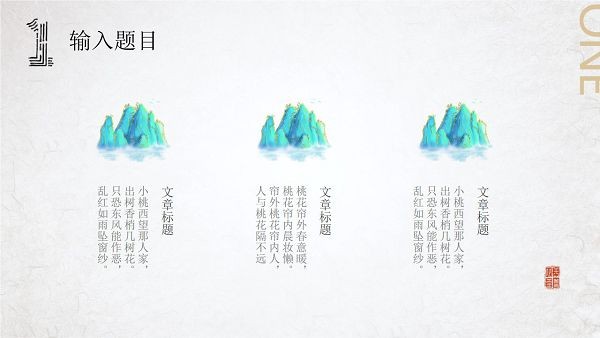 PowerPoint模板内容页,由多张水墨群山插图,搭配PPT文字排版。