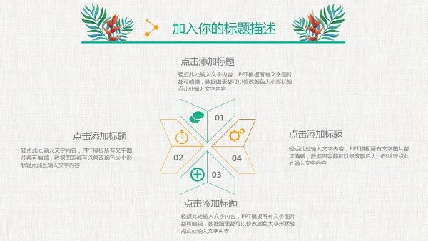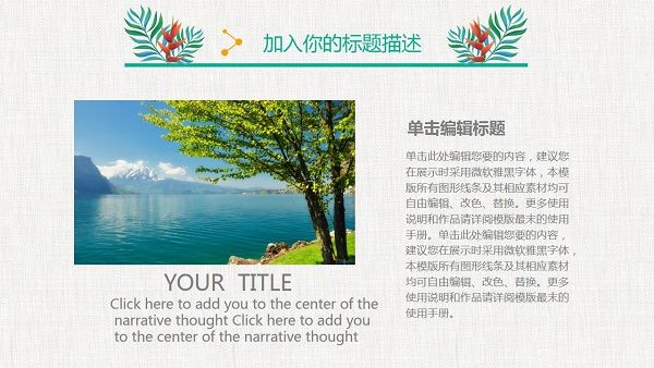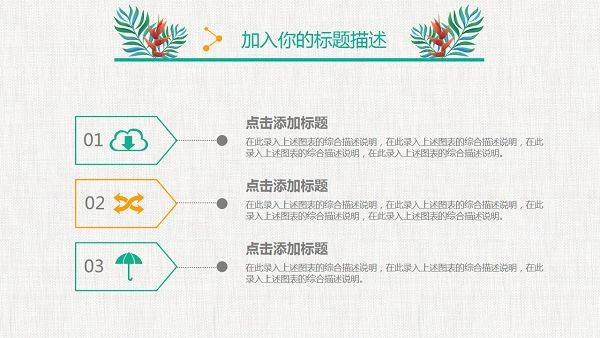 版权声明:精美彩色叶子清爽夏季PPT模板所展示的资源内容均来自于第三方用户上传分享,您所下载的资源内容仅供个人学习交流使用,严禁用于商业用途,软件的著作权归原作者所有,如果有侵犯您的权利,请来信告知,我们将及时撤销。