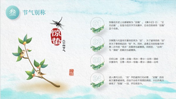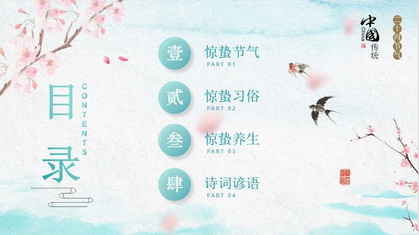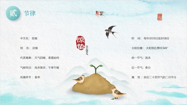 软件可以用来制作推广介绍惊蛰节气的幻灯片,格式为ppt演示文档,里面包含多个板块,内容丰富全面,帮助大家了解惊蛰的相关习俗,了解中国传统文化。