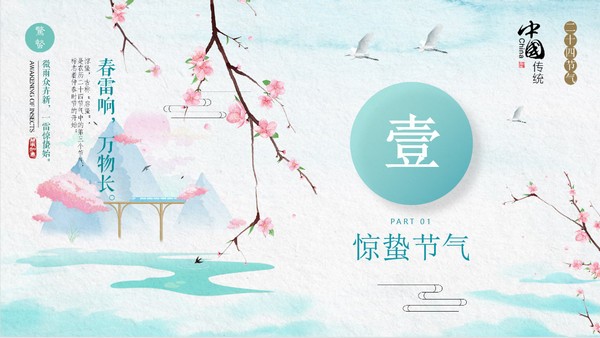 惊蛰作为中国的二十四节气之一,有许多相关的诗词谚语以及风俗习惯,现在小编为大家分享非常多的人都在使用人用的一款专门用来介绍惊蛰节气的演示文档模板,它就是精美水墨惊蛰节气PPT模板,这款模板采用了蓝色和粉色搭配的色调,看起来十分唯美浪漫,上面带有水墨画的元素,让用户制作出美丽的幻灯片。
