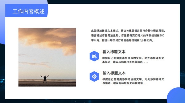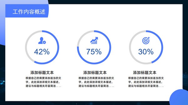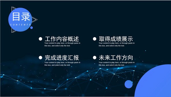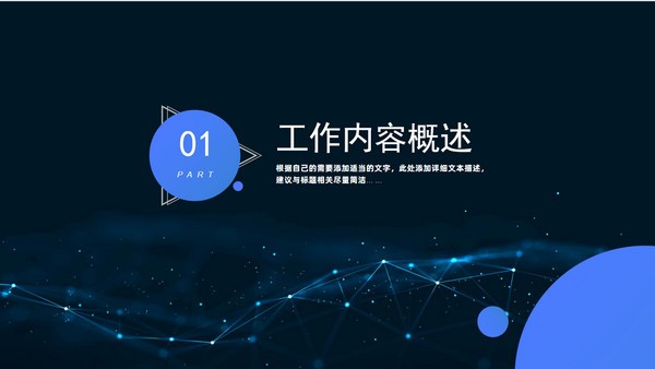 圆圈三角形几何风个人述职报告ppt模板,本模板共20P,目录:工作内容概述、取得成绩展示、完成进度汇报、未来工作方向,点线网科技蓝背景,圆形、三角形几何风创意封面、目录页、过渡页,卡片式UI几何风版式内容页,科技蓝配色,扁平化图表,适合个人工作汇报、年终总结、个人述职报告等场景应用的商务通用ppt模板。