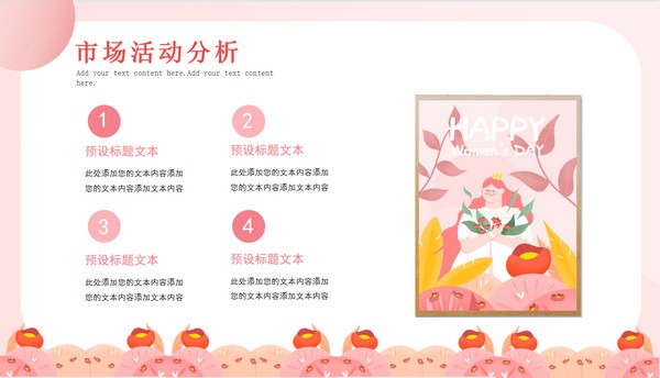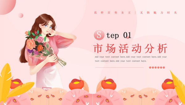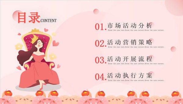 2022三八女神节活动营销策划PPT模板走的是小清新风格,整体采用粉粉的色调,内容包括市场活动分析、活动营销策略、活动开展流程以及活动执行方案,还插入了美美的卡通女神绘画图案,具体效果可以参考下文展示,用来制作女神节的营销活动PPT非常不错~