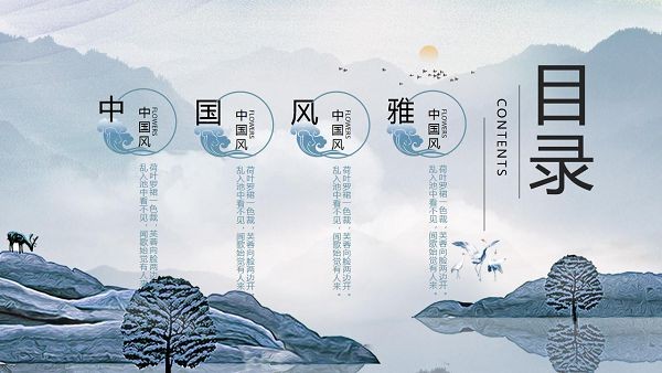 软件是中国风的PPT文档制作模板,内容十分丰富,可以用来制作商务工作汇报或者课件,整体色调为蓝色,既优雅又低调,上面的山水画素材都十分精致高清,完全免费提供。