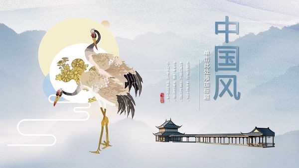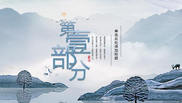 PPT模板封面使用了艺术化处理的 群山、湖面、仙鹤、小鹿等背景图片。中间竖向填写中国风PPT标题。界面风格唯美禅意。