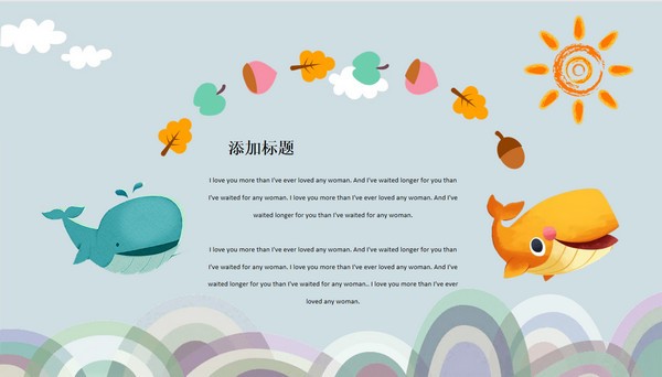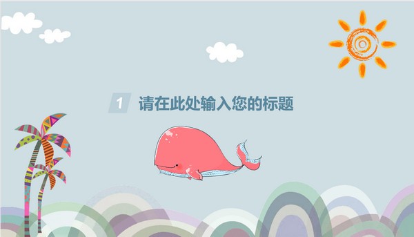 卡通鲸鱼插画背景教师说课ppt模板一共有32页,风格偏向卡通童趣化,插入了鲸鱼、海浪、椰子树、白云等卡通图案,具体样式可以参考下文展示,用来制作幼儿园、小学PPT课件或者美术课PPT课件等都很不错,模板的源文件是.PPTX格式的,下载后可以自行编辑修改。