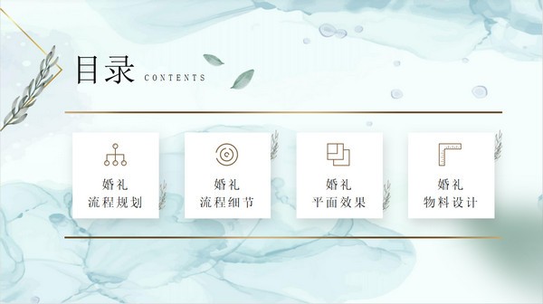 高级大气唯美小清新婚礼策划ppt模板,本模板共25P,目录:婚礼流程规划、婚礼流程细节、婚礼平面效果、婚礼物料设计,大气高级感版式内容页,完整框架内容婚礼策划ppt模板。