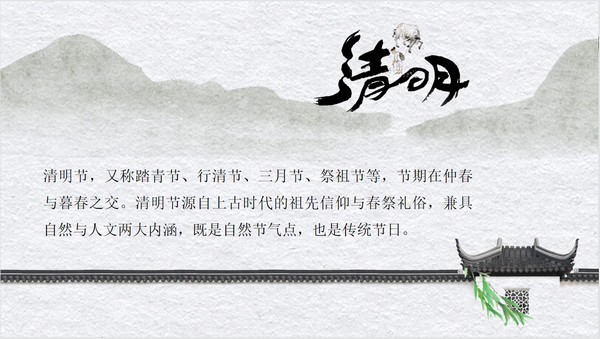 简约中国风传统佳节清明节ppt模板是以清明节为主题制作的一套中国水墨风ppt,源文件为.PPTX格式,共26P,喜欢的话可自取。