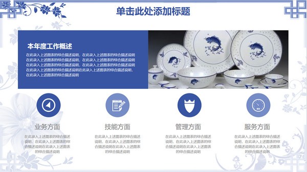 PowerPoint模板内容页,由35张蓝色动态幻灯片图表,与PPT文案排版。另外使用了中国青花瓷PPT插图装饰。