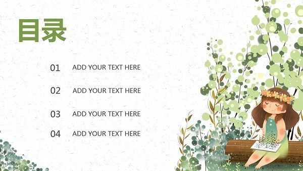 PPT模板采用了水彩风格设计制作。PPT封面右侧放置一位在树林中读书的小女孩背景图片,左侧填写PPT标题。界面风格卡通可爱。
