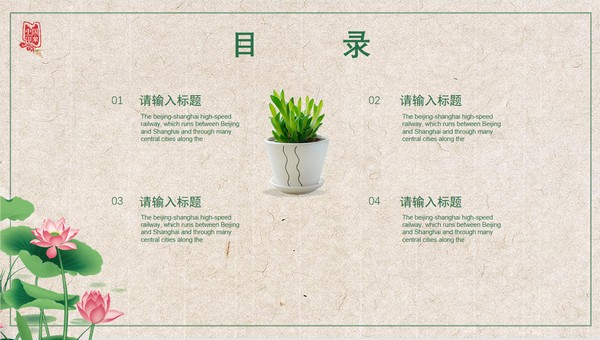 牛皮纸背景简约小清新古风教学课件ppt模板,牛皮纸背景,荷花、竹叶、水墨烟云、江南房子、毛笔字、红印章、盆景、腊梅、茶壶、毛笔、仙鹤、大门门把手、砚台等中国风元素配图,简约大气古风设计,小清新绿配色,适合教育教学课件、教师说课、教师工作总结等场景应用的简约中国风ppt模板。