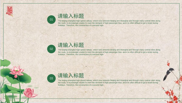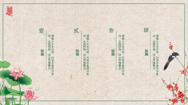 软件一共包含了20张ppt页面,内容支持用户自由修改编辑,图片和文字的排列很有美感,还有荷花、鸟等中国风元素,为PPT增添了更多色彩,很适合用来制作教学文档。