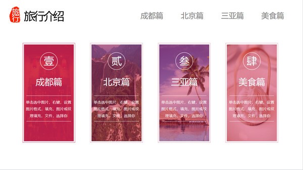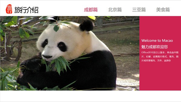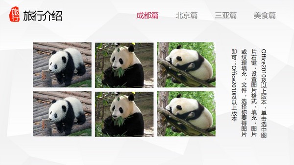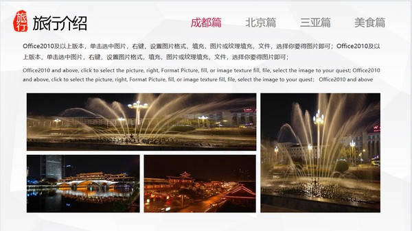 PowerPoint模板内容页,记录了去成都、北京、三亚旅游的照片和文字记录。另外介绍了各地的美食。