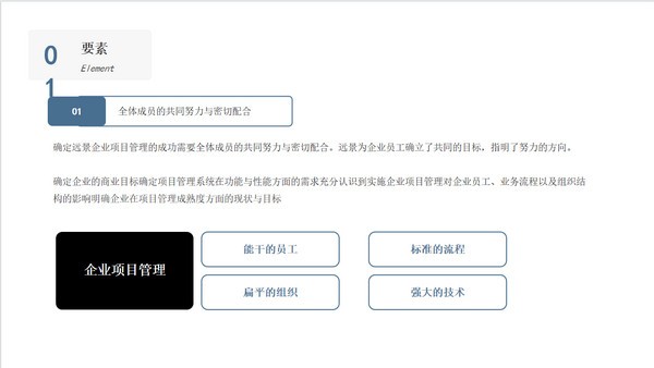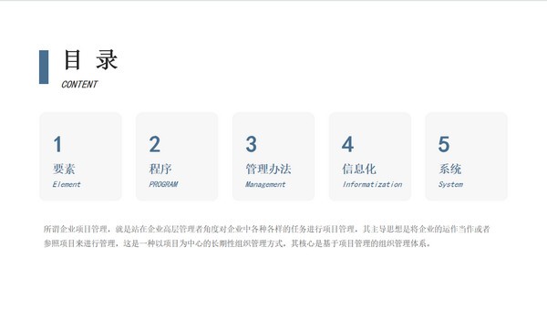 非常多的人都在使用企业都会在员工刚入职期间对大家进行各个方面的介绍和培训,我们可以通过这款企业文化管理培训PPT模板软件来制作管理培训的幻灯片演示文档,这款模板采用了简约的设计风格,一共包含五个板块,能够更好地向员工们展示企业的文化和要求,非常方便对新员工进行培训,效果很好。
