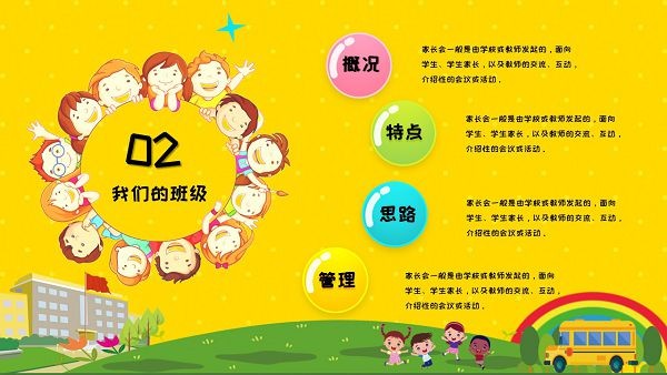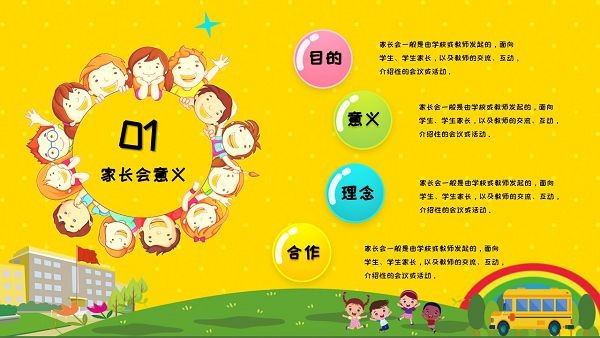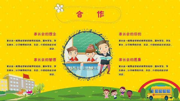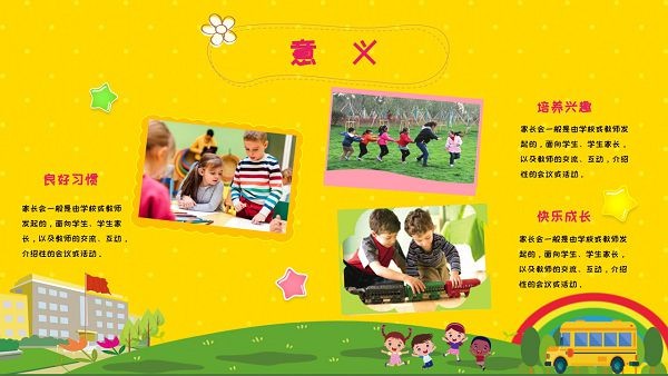 版权声明:黄色卡通幼儿园家长会PPT模板所展示的资源内容均来自于第三方用户上传分享,您所下载的资源内容仅供个人学习交流使用,严禁用于商业用途,软件的著作权归原作者所有,如果有侵犯您的权利,请来信告知,我们将及时撤销。