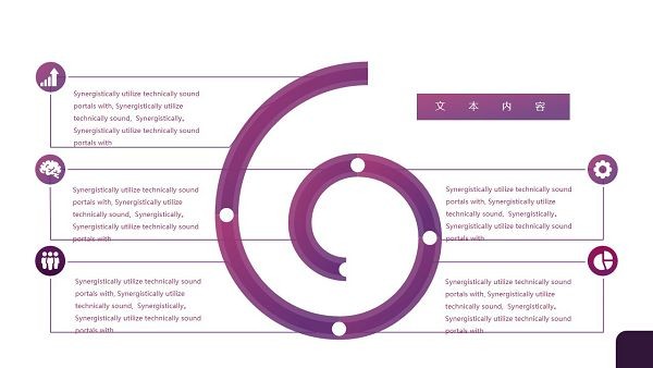 PowerPoint模板内容页,由23张紫色渐变幻灯片图表,搭配英文文字排版。另外使用了黑白商业建筑插图、办公桌面插图、职场人物插图等装饰。