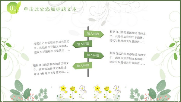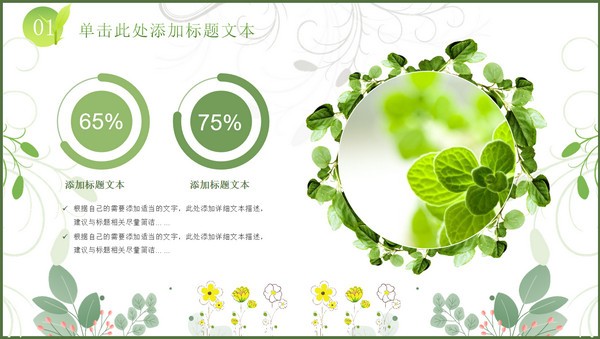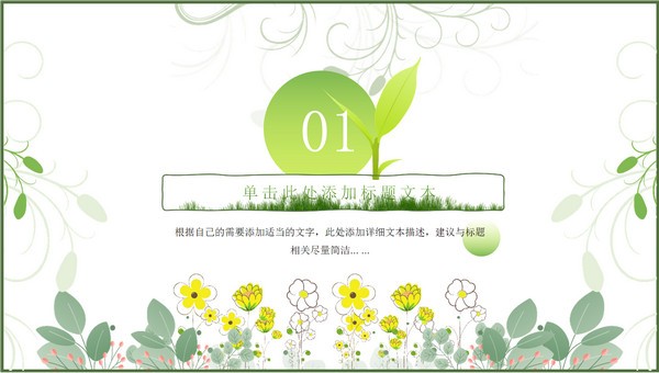 活力新绿春季工作计划ppt模板,本模板共23P,矢量花草、藤叶、嫩芽、绿草文本框标题文字创意封面、目录页、过渡页,活力新绿配色,扁平化图表,简约活力清新风版式内容页,适合工作计划、工作汇报等场景应用的春季新绿商务通用ppt模板。