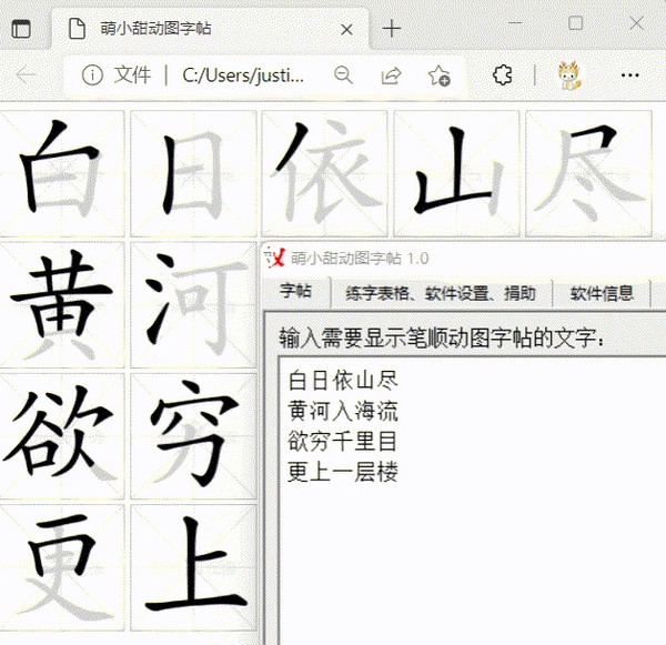 软件很适合刚开始学习写字的孩子们使用,能够帮助用户快速生成出文字动图字帖效果,从而直观展示写字的笔画顺序,文字内容能自由添加,对于练字有很大的帮助。