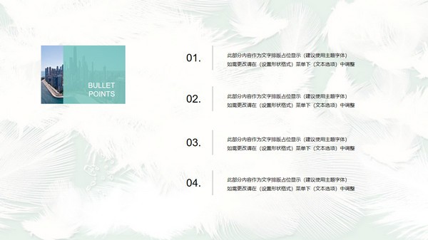 小清新羽毛创意PPT模板完全免费,可以用来制作各种不同类型的幻灯片演示文档,模板的风格比较清新简约,背景上带有羽毛图案,看起来十分唯美,用户通过该模板能更好地展示自己的文档内容,通用性很强,不管是用来制作课件还是工作汇报总结等内容很很合适,支持用户自由修改。