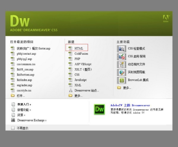 1、我们打开DW软件,出现如下窗口,我们点击“新建-HTML”