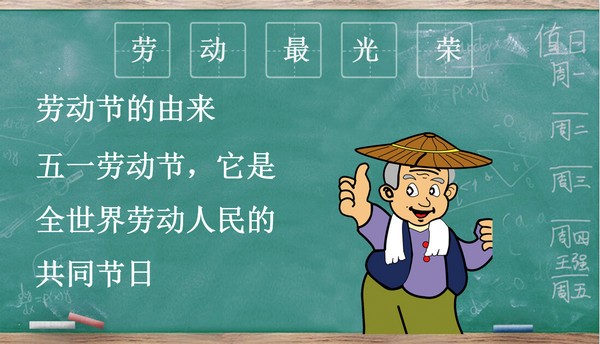 版权声明:黑板风五一劳动节主题班会PPT模板所展示的资源内容均来自于第三方用户上传分享,您所下载的资源内容仅供个人学习交流使用,严禁用于商业用途,软件的著作权归原作者所有,如果有侵犯您的权利,请来信告知,我们将及时撤销。