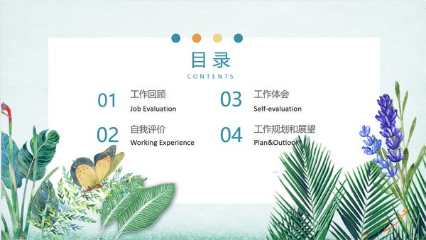 本模板共23P,目录:工作回顾、工作体会、自我评价、工作规划和展望,植物叶子、藤蔓、花卉、蝴蝶主图创意设计封面、目录页、过渡页,扁平化小清新图表,适合个人总结、个人述职报告、自我评价等场景应用的植物藤蔓花卉文艺小清新ppt模板。